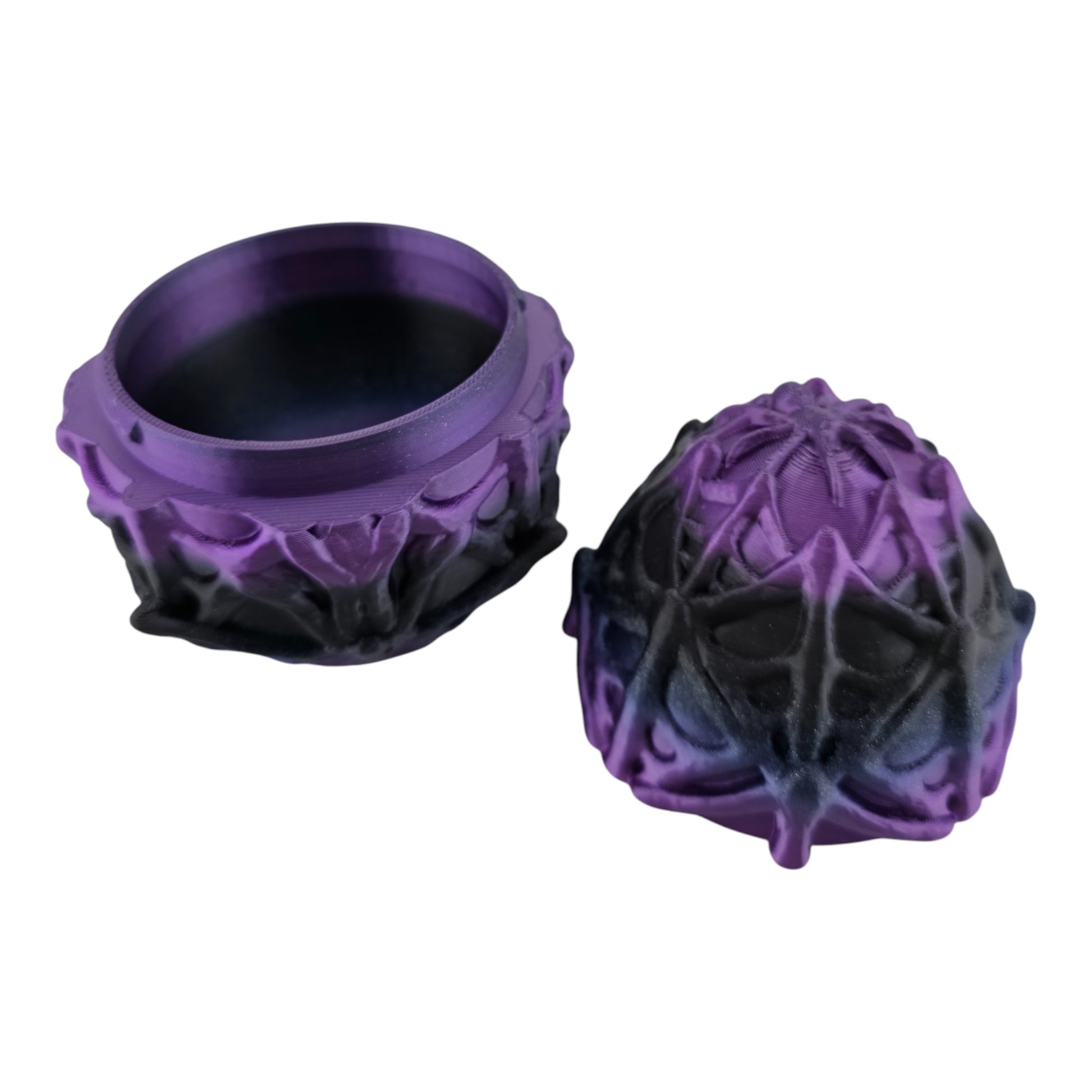 The webbed egg itself adds to the festive display, doubling as a gothic-inspired storage shell or decorative piece. Each creature is carefully 3D printed to highlight fine textures and expressive details, making every piece unique and full of personality.