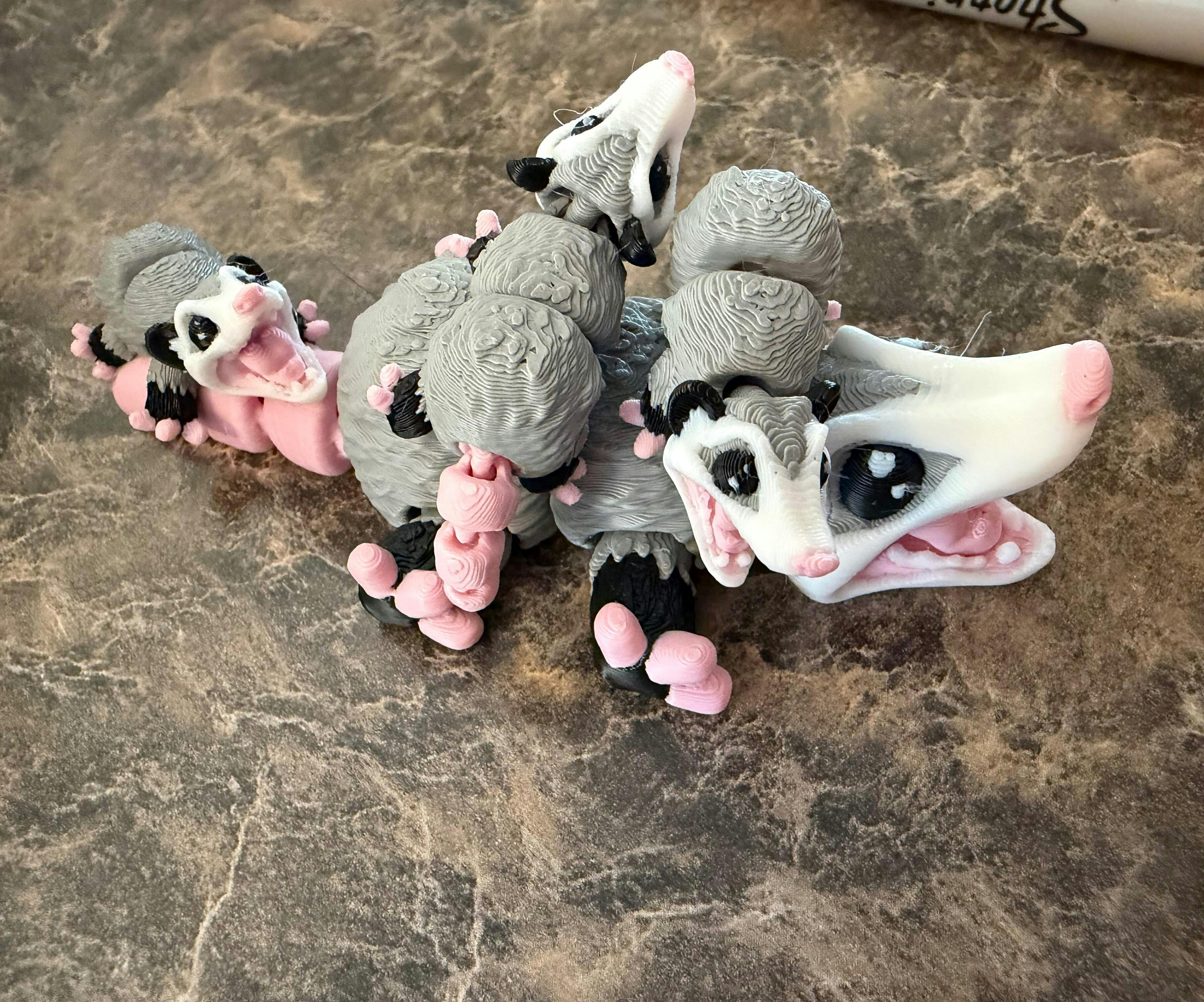 The Opossum Family Set is a whimsical 3D printed creation featuring one adult opossum and three articulated babies. Each piece is designed with movable joints, allowing you to pose them in playful, dynamic ways and create fun display scenes.